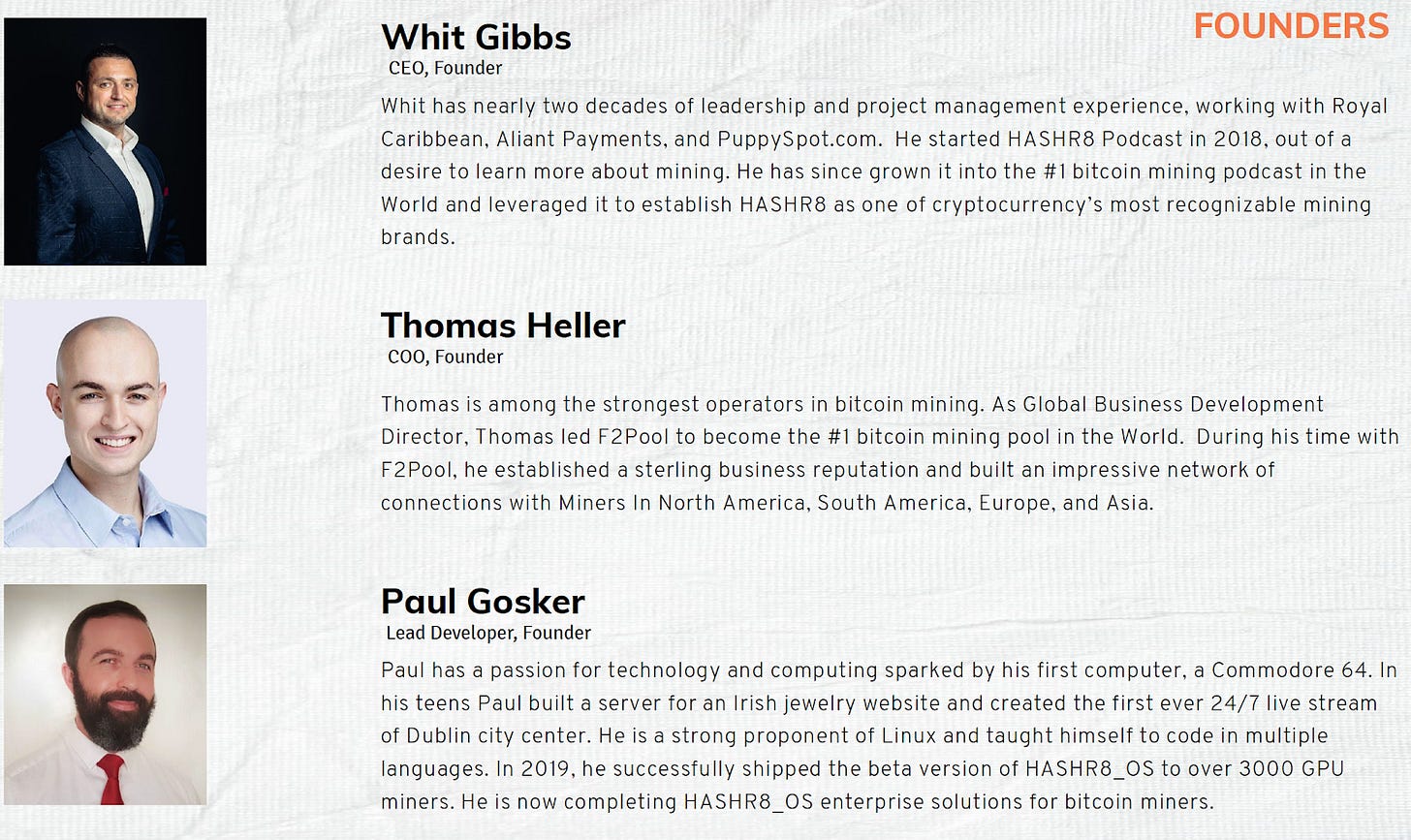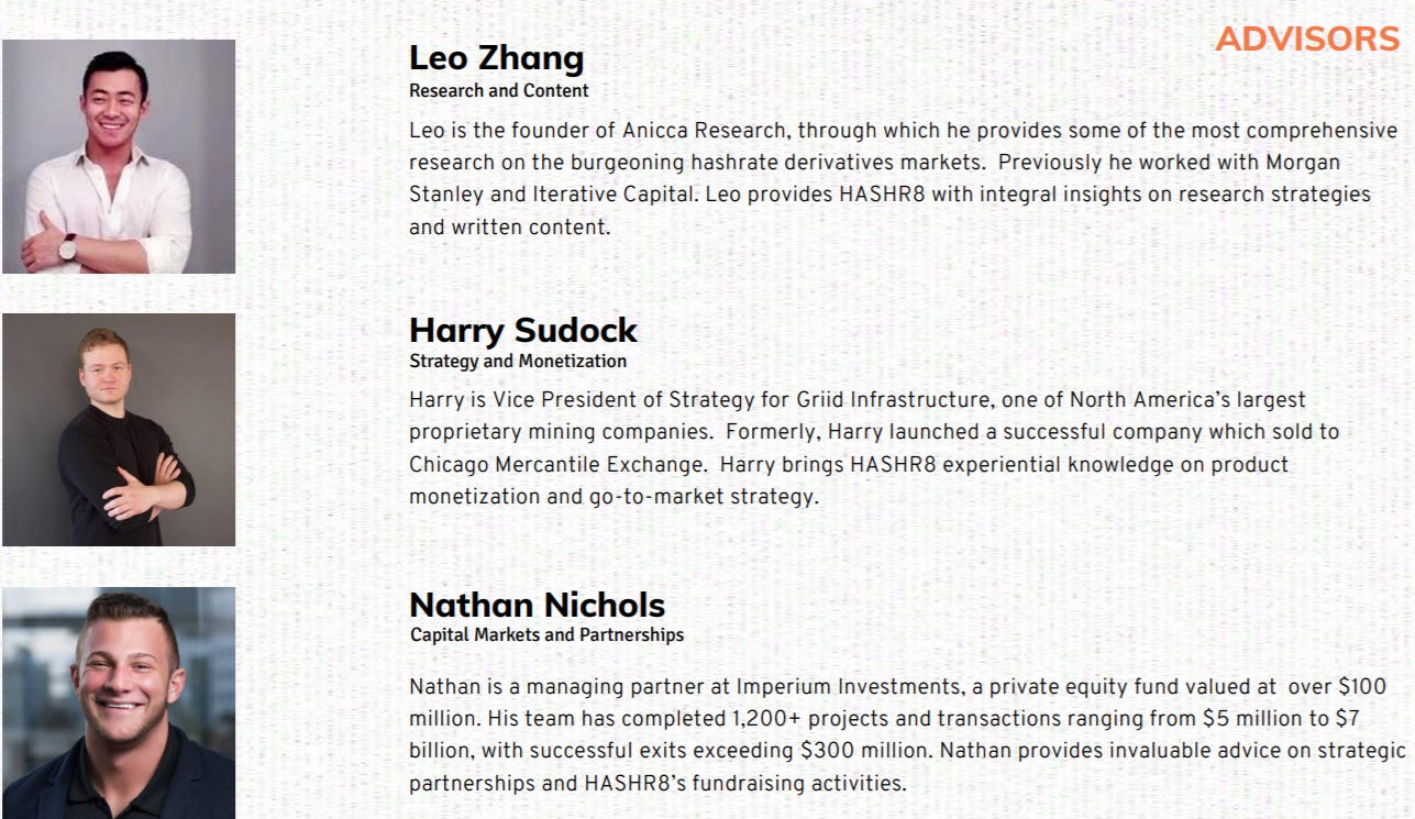 Leo Zhang (0.5% equity) - Leo produces industry-leading content on the developing hash rate markets and advises HASHR8 on data aggregation and content strategy.