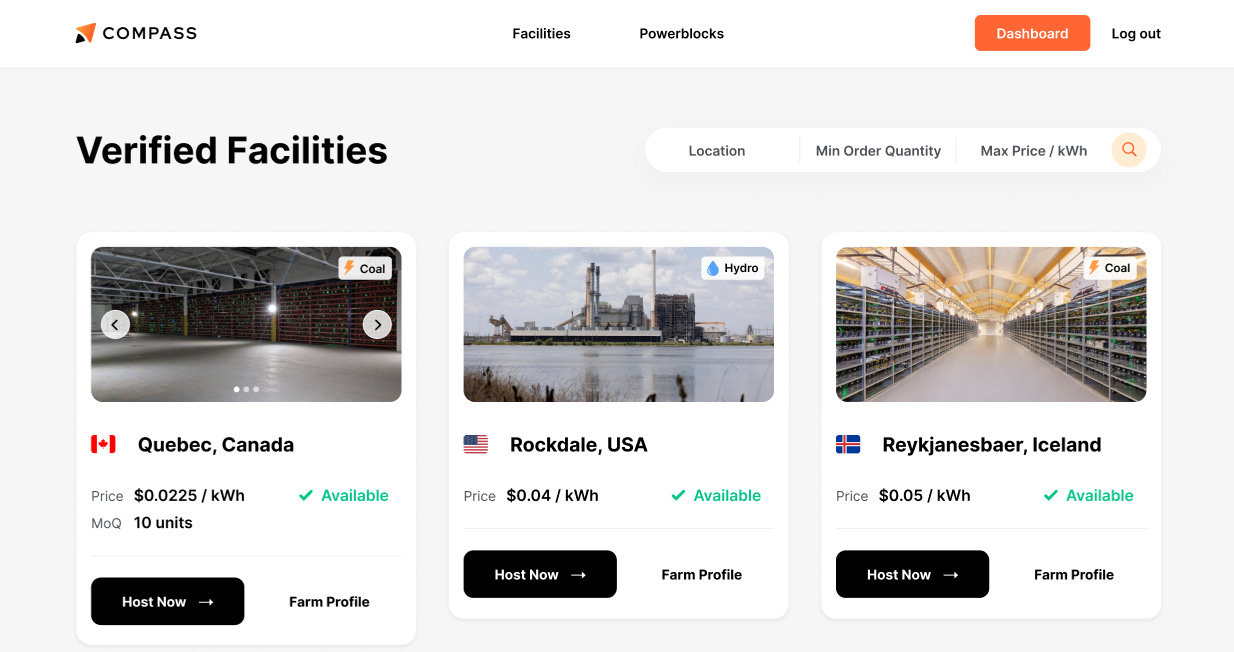 A comprehensive screening of every facility is done by Compass before the onboarding, including a check of corporate documents, an interview process, and reference checks. Customers on Compass and Powerblocks will then be presented with all relevant information about the respective facilities, including but not limited to information about the electricity costs, security measures and a geopolitical index assessing the regulatory risk of the facility’s location.