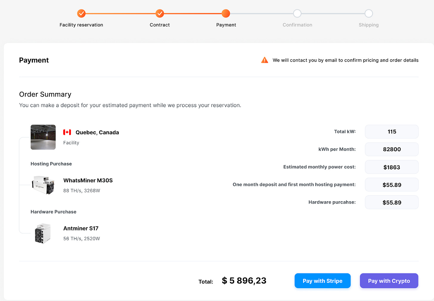 Using Compass, investors can easily purchase mining hardware and host it at a hosting facility of their choice, through the App. Compass’ diligent onboarding steps for hardware providers and hosting facilities accommodate investors with the trust assurances necessary for them to feel comfortable with the counterparty risks. All vendors must abide by certain standards before being verified and being made available to investors via Compass.